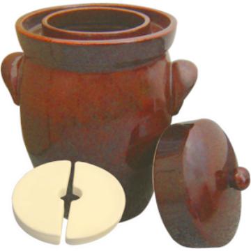 K&K Keramik is well known for beautiful hand-made pottery and rum pots. K&K also makes Gartopf Fermenting Crocks with the same high-quality standards and beauty. These “Form 2” style fermenting pots, known under the name “Kerazo” in Europe, are handcrafted, made in Germany, and designed in a modern, functional bulbous shape with side handles. Each crock comes complete with pot, lid, weighing stones, and instruction/recipe book. This fermenting crock is very attractive, sturdy, easy to use and quite functional.